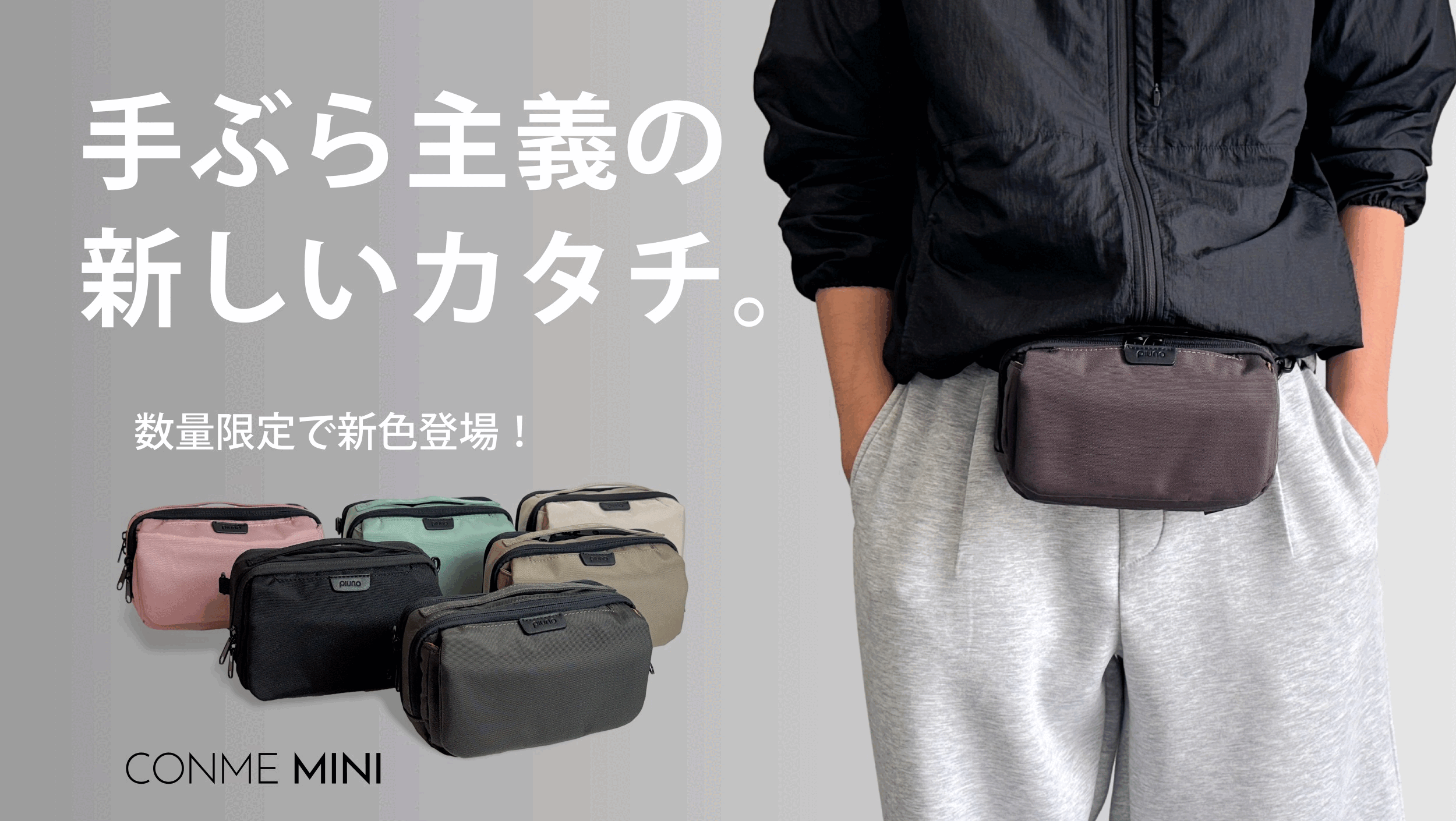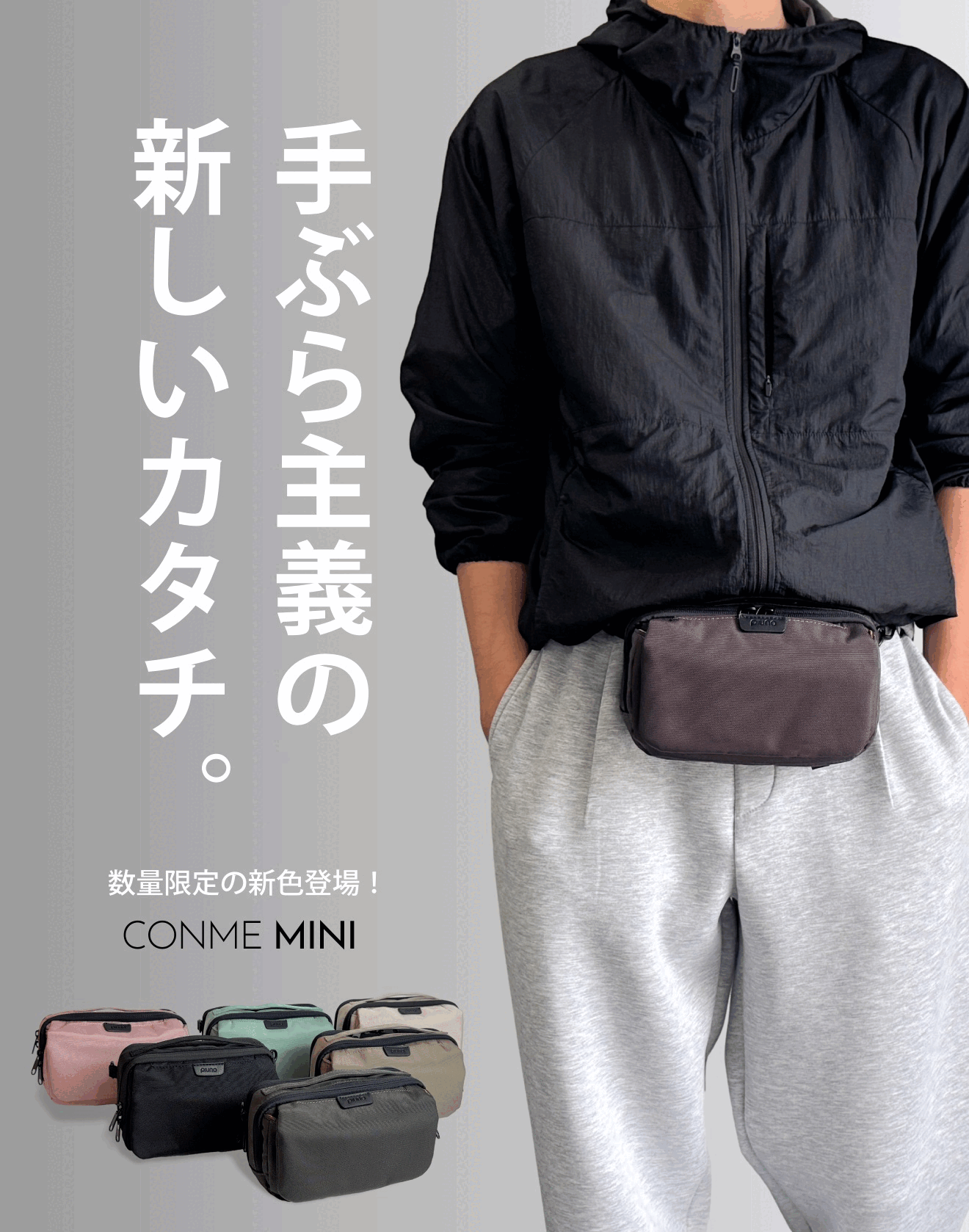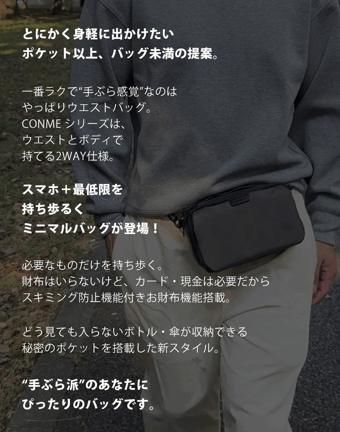 CONME MINIならウエストや腰でバッグを持てるので、重さも感じにくく、肩の負担もなく快適にお出かけが出来ます!