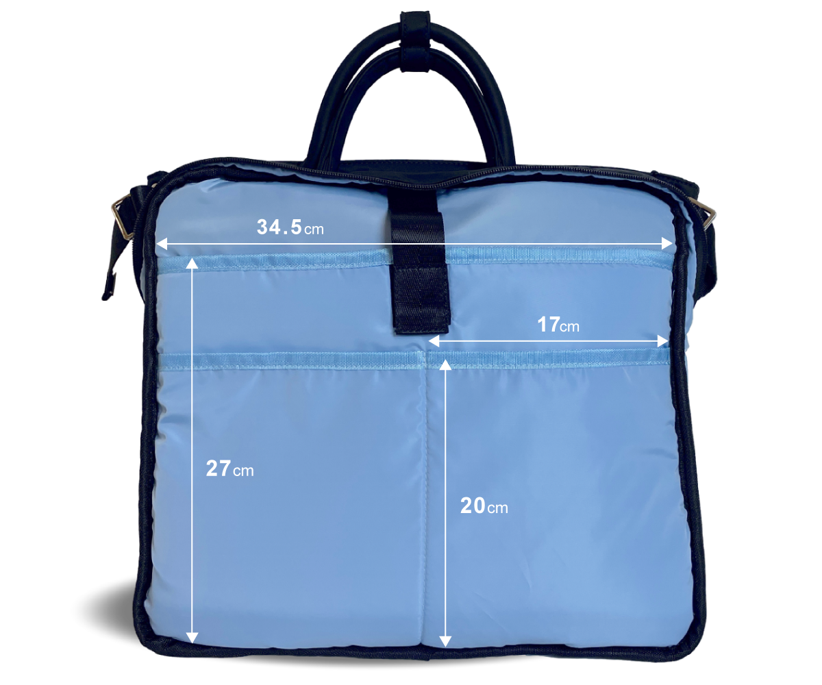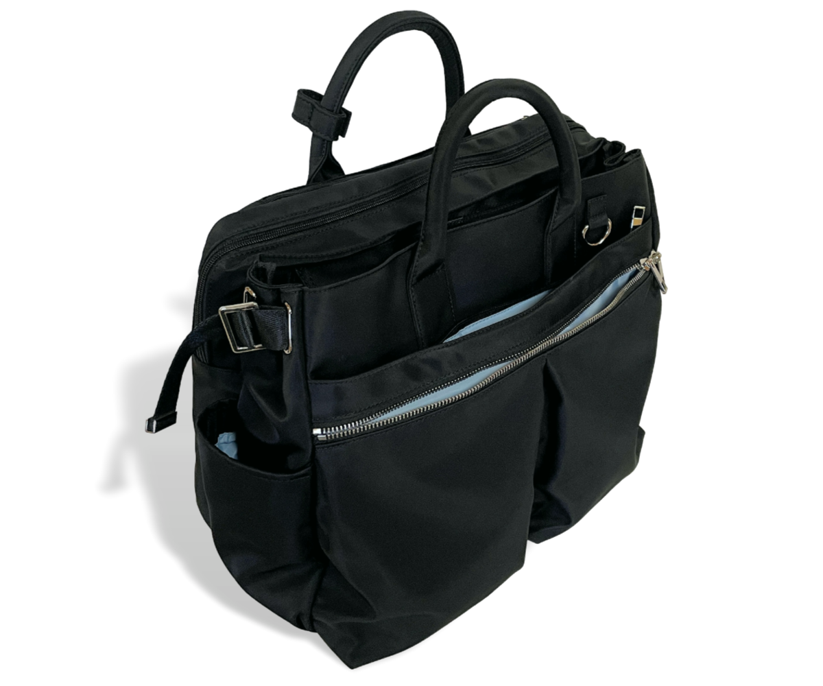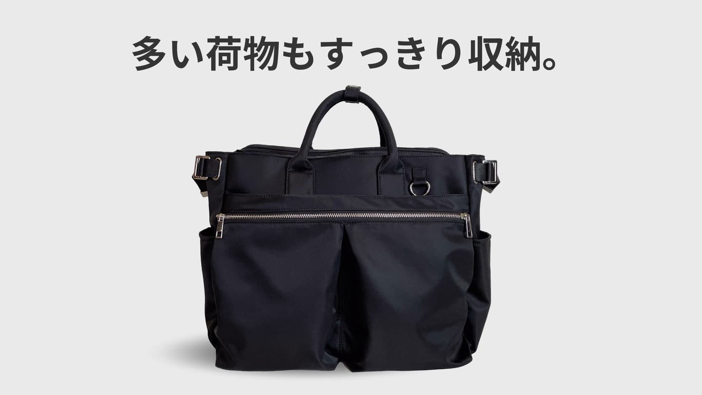 バッグのメイン収納(3層目と4層目)は、マイボトルなど私物を入れる大容量スペースと、PCや書類を収められるブリーフケース風のビジネス向けスペースの 2層構造。用途に合わせてすっきり分別して収納できます。