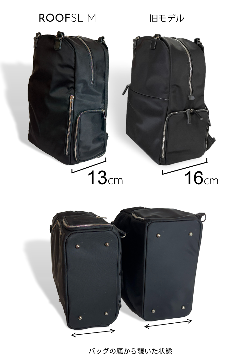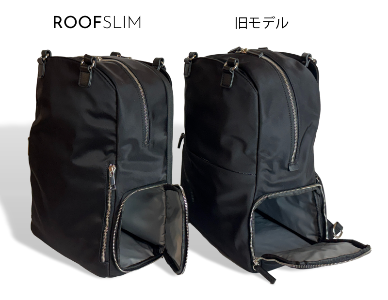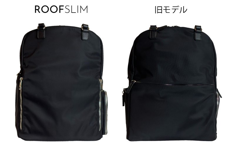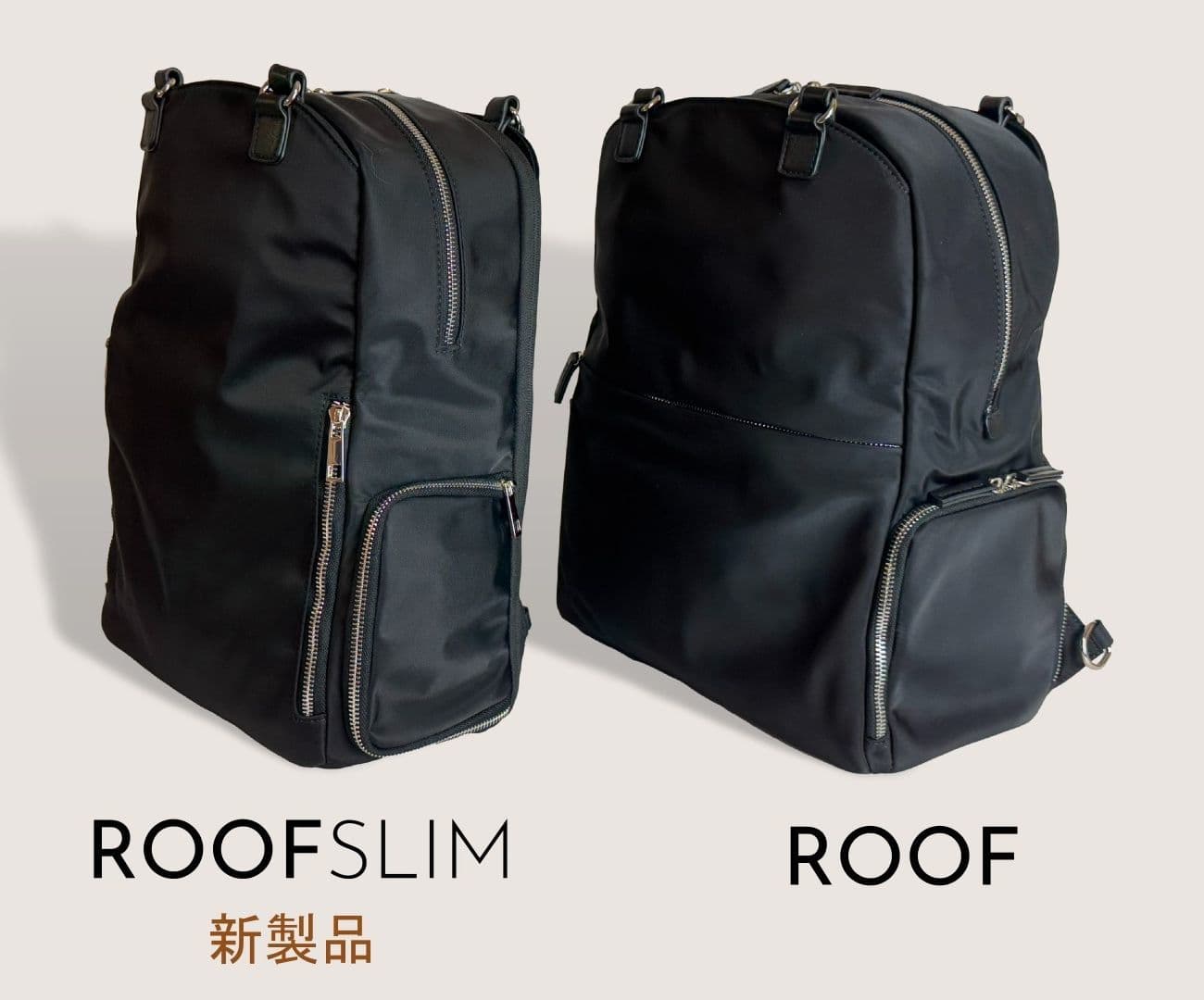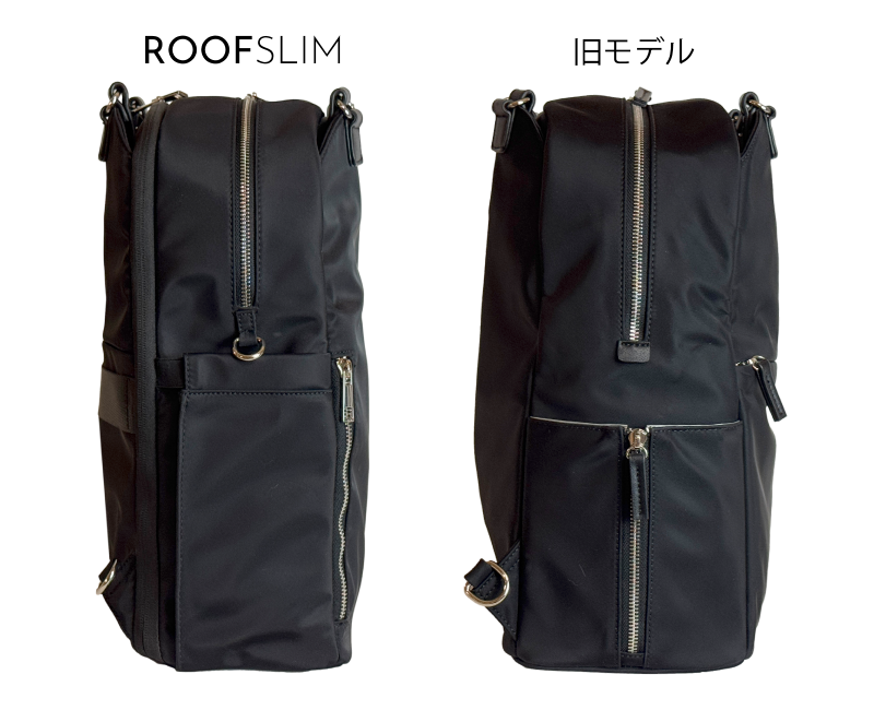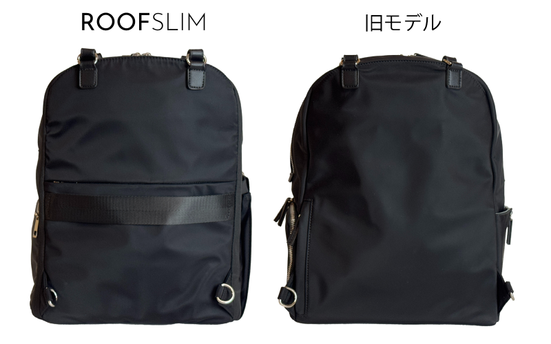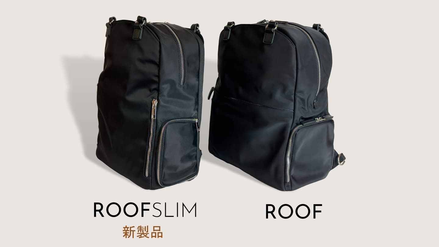 バッグのフォルムは、上部の丸みを減らし、その分内部スペースを確保しました。旧モデルROOFは、レディースのイメージが強いデザインでしたが、ROOF SLIMは、ユニセックスでご使用いただけます。