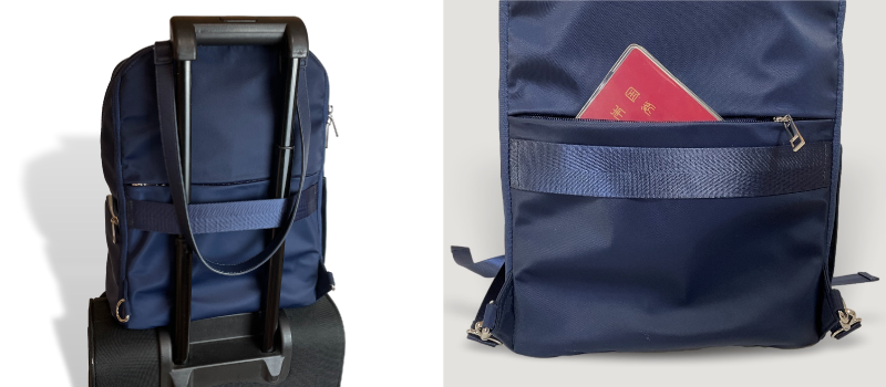バッグの背面に、新たに大きなファスナーポケットとキャリーバックに固定できるホルダーを追加しました。