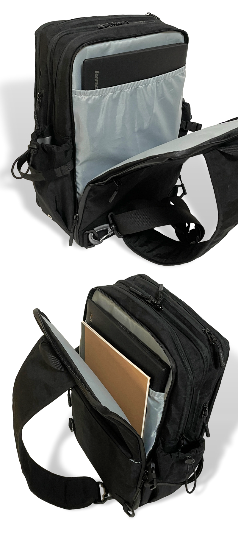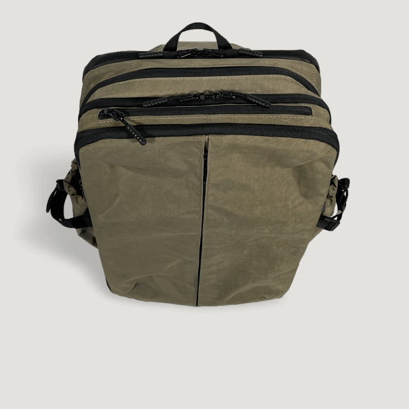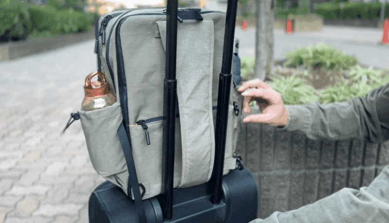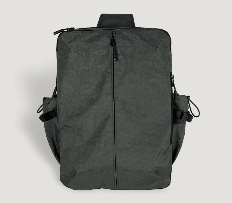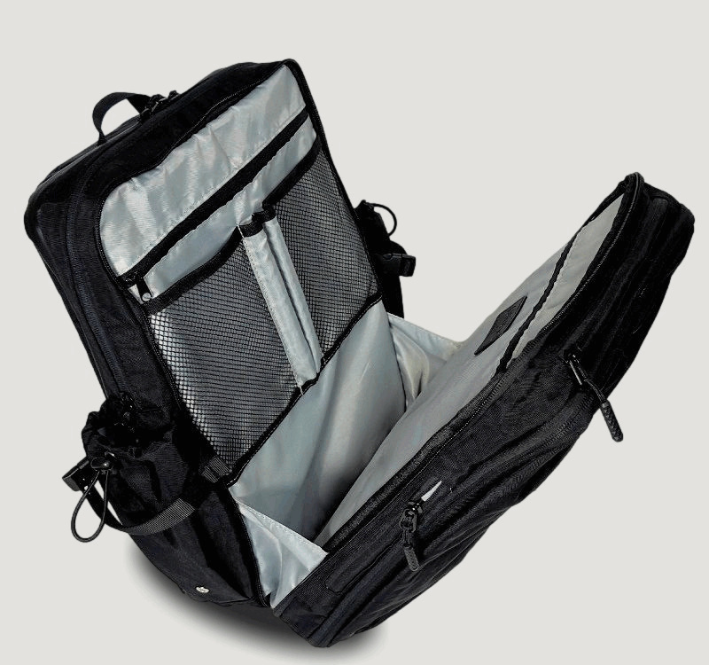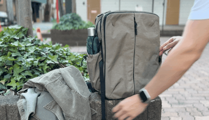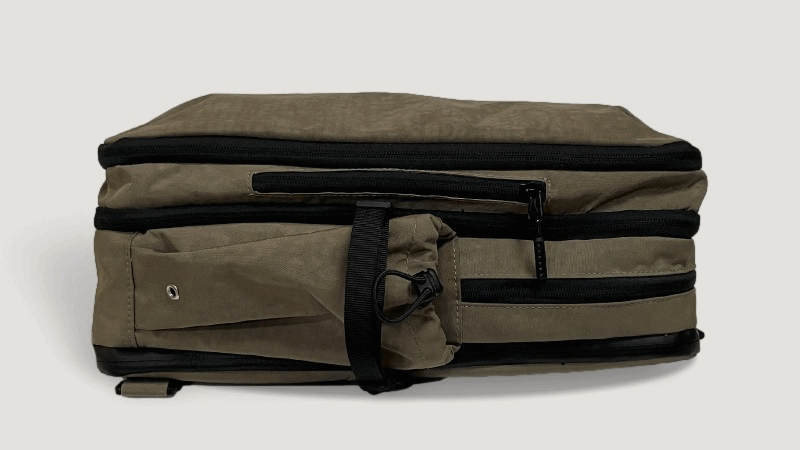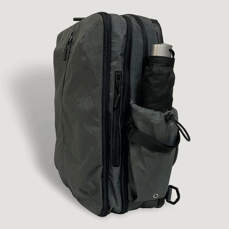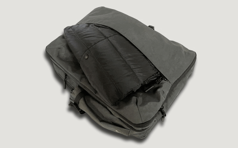 ファスナーをグルっと一回りして開閉するこの拡張スペースを使用すると、出張や外泊に必要な衣類や、ジムで使用する着替えなど、1泊分の荷物やスニーカーが入るほどのスペースを確保でき、別にカバンを持参する必要もありません。