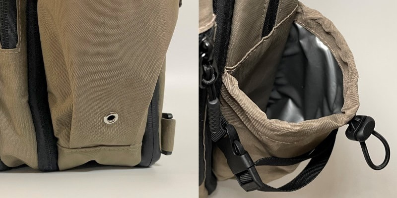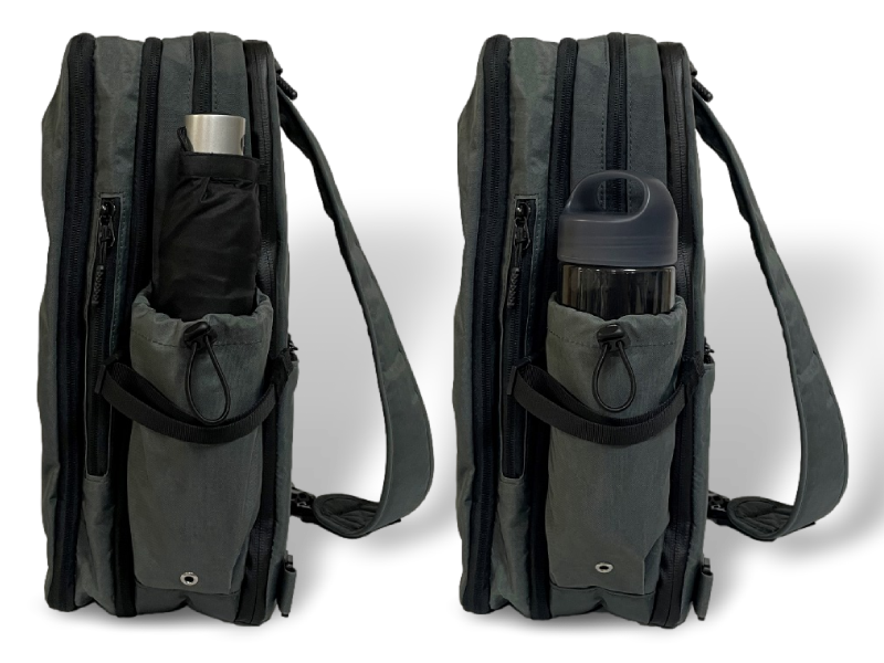 バッグの両サイドには75mmまでのボトルや折りたたみ傘が入るポケットが付いています。バッグの中に入れると邪魔になるときや水分補給が多い日に安心です。