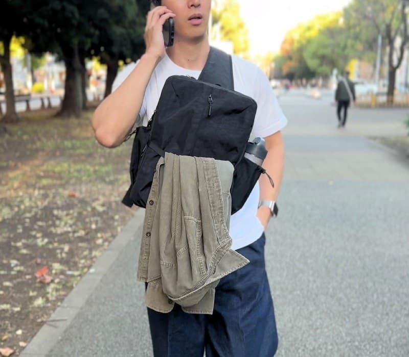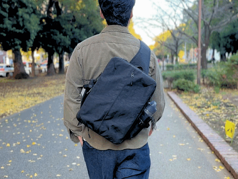 リュックと違っていちいちバッグを降ろさなくても後ろから前へクルっと移動できるのが、スリングバックの大きなメリットですね!