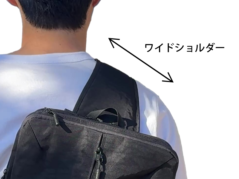 ワンショルダーならではの幅広ショルダーは背負っていて意外にリュックより楽に感じていただけます。