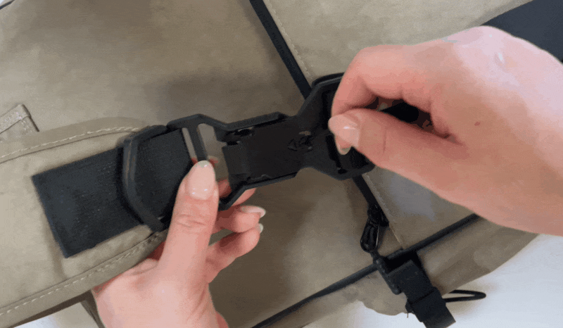 このバックルは引手を引き上げるだけで簡単に外れ、近づけるとカチッと自動で接続してくれるマグネット式バックルを採用しました。