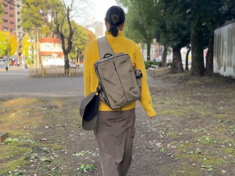 電車での移動時は、手で持ったり、前掛けしても身体からはみ出さずにちょうどいいサイズ感で周りの人の邪魔になりません。