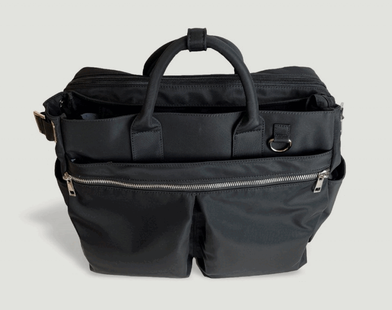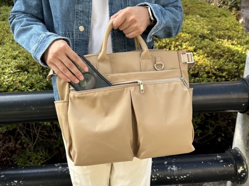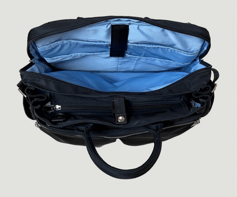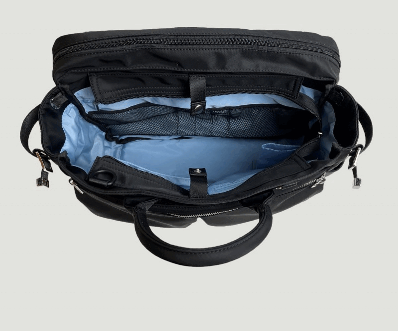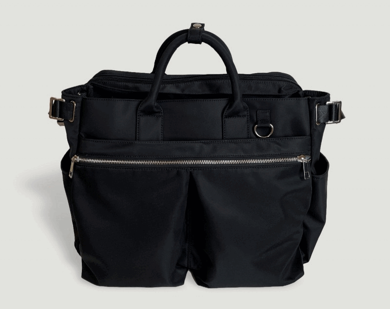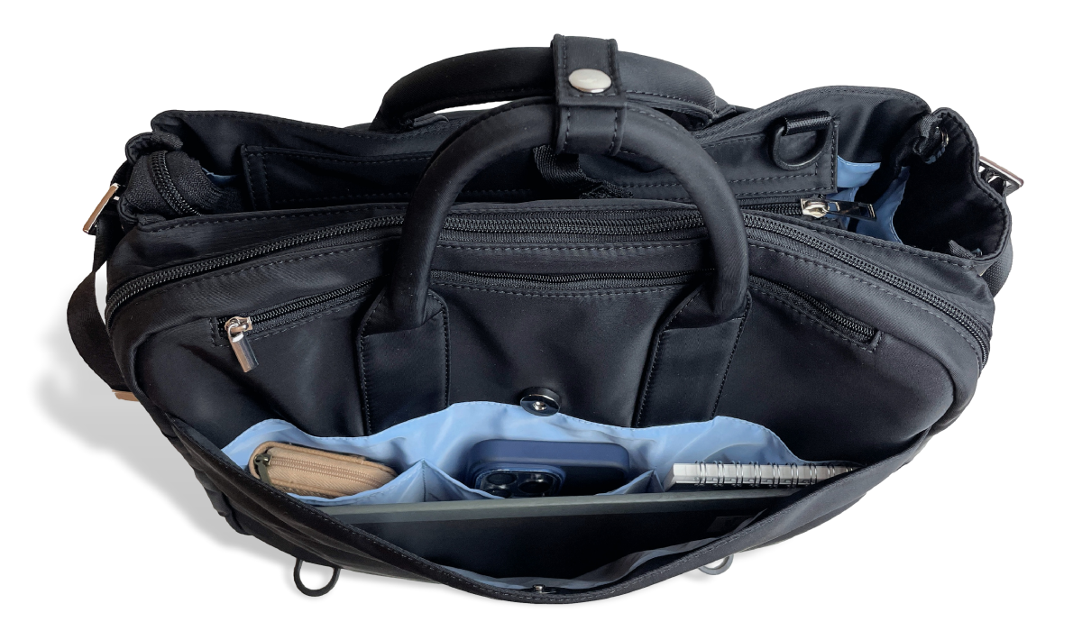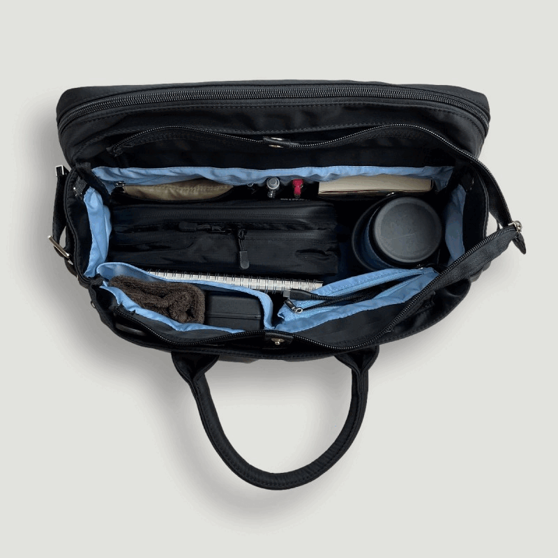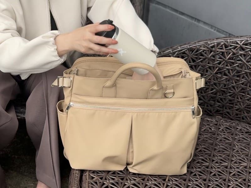 バッグのメイン収納(3層目と4層目)は、マイボトルなど私物を入れる大容量スペースと、PCや書類を収められるブリーフケース風のビジネス向けスペースの 2層構造。用途に合わせてすっきり分別して収納できます。