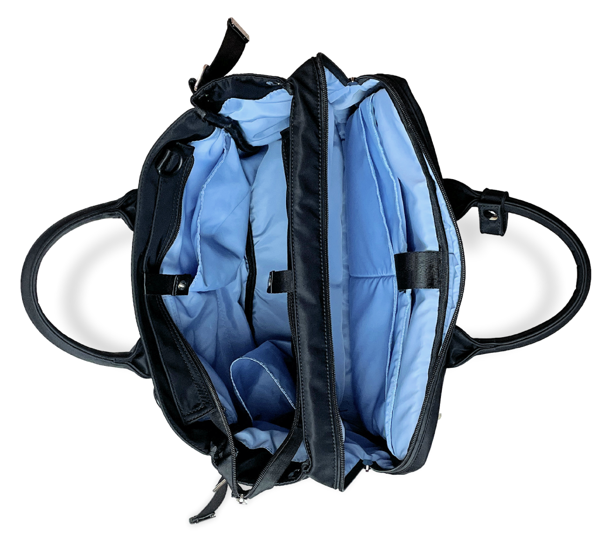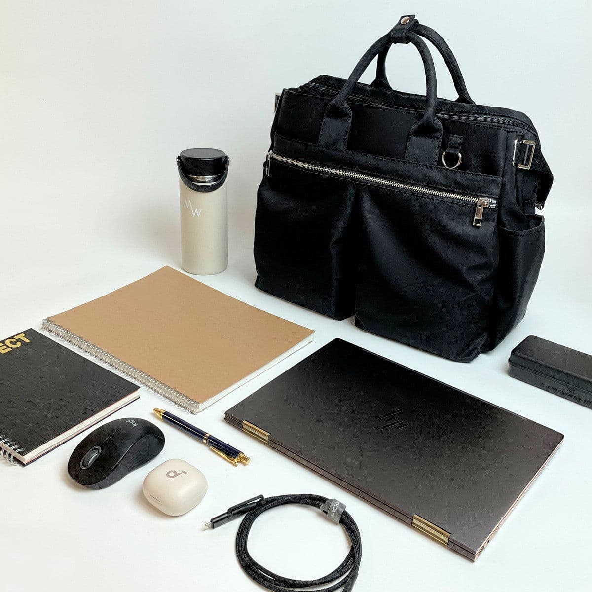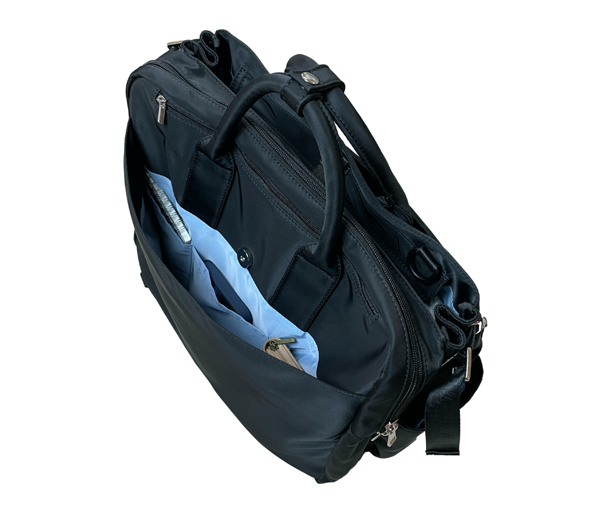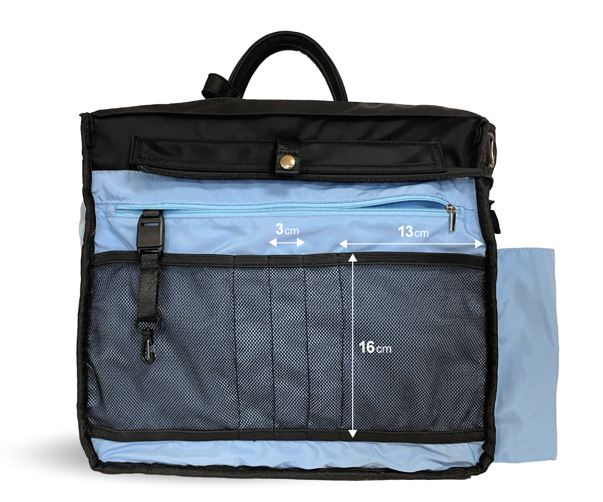 バッグのメイン収納(3層目と4層目)は、マイボトルなど私物を入れる大容量スペースと、PCや書類を収められるブリーフケース風のビジネス向けスペースの 2層構造。用途に合わせてすっきり分別して収納できます。