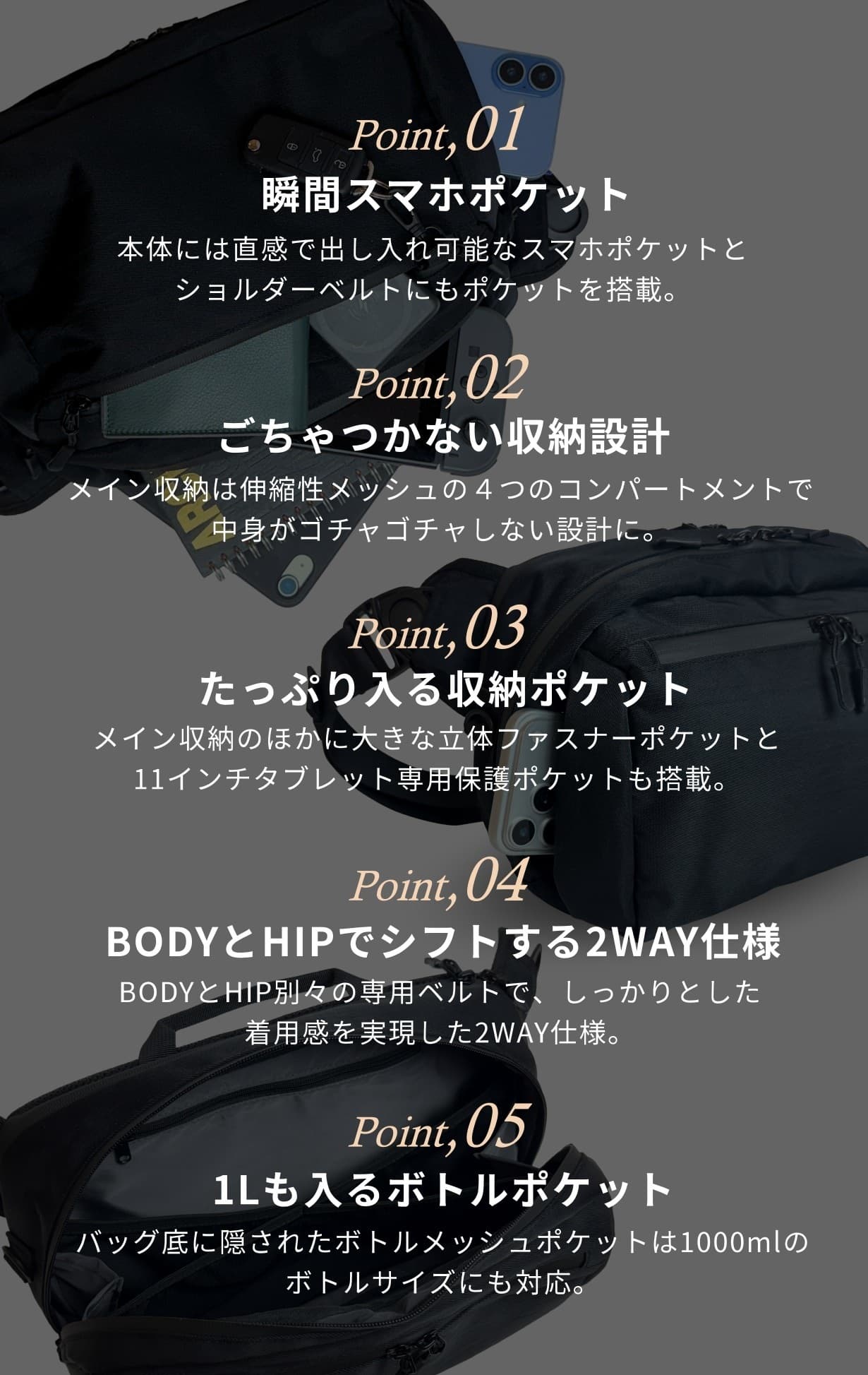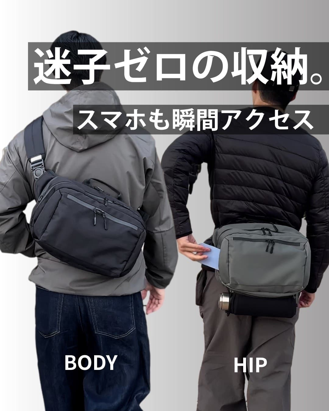 BODYバッグを前掛けしているときや、HIPバッグとして着用している時でも直感でスマホの出し入れができます。