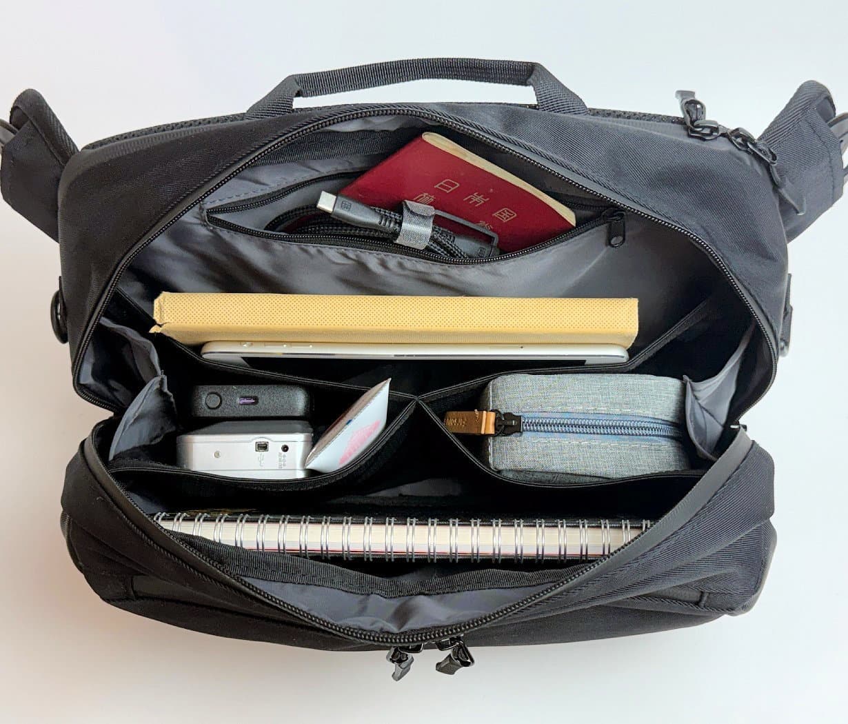 メインの収納スペースは、伸縮性メッショ素材で仕切られた4つのコンパートメントを活用し、下記画像のようにゴチャゴチャにならず自然とスッキリ整理整頓できます。