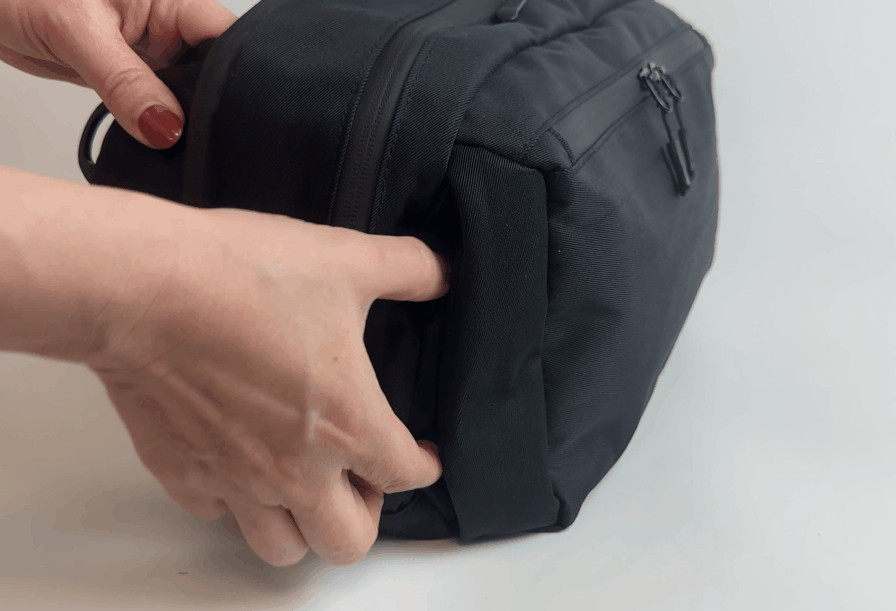 PASSO SHIFTは、メイン収納にも500mlや1000mlのボトルを収納可能ですが、荷物が多い時など、必要な時だけ出して使える秘密の隠しボトルポケットをバッグ底部分に搭載しました。