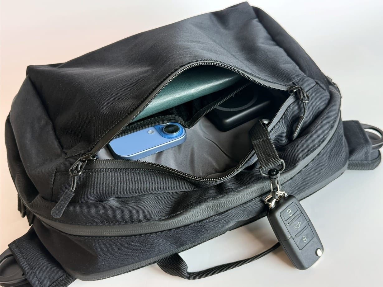 先にご紹介したようにこのメインポケットは、4つのコンパートメントで区切られており、大きなものと小物が自然と整理される構造になっております。