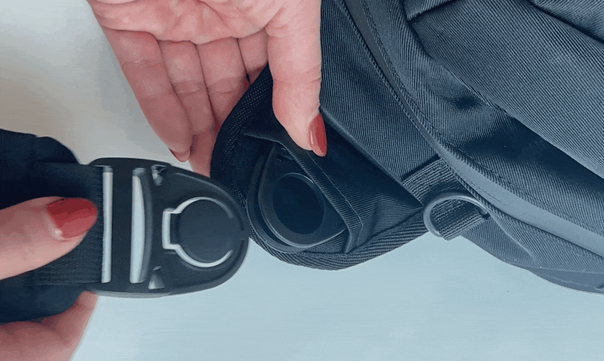 各ベルトとバッグ本体との接続部分のバックルは、ワンプッシュで取り外し、差し込むだけで固定できる、回転式の丸バックルを採用しました。
