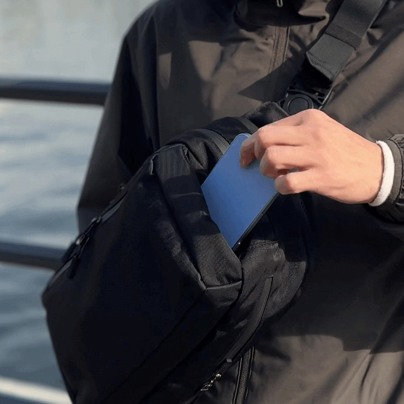 このスマホポケットは隠しマグネットで、指を差し込むだけで開閉しスムーズにスマホにアクセスできます。