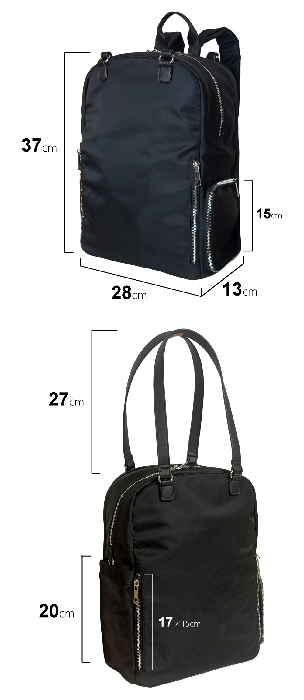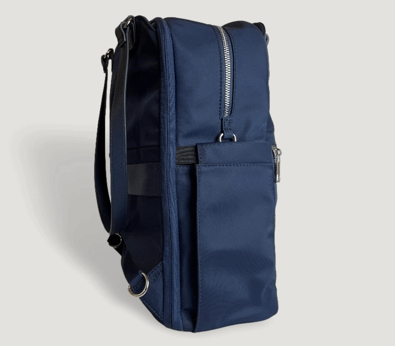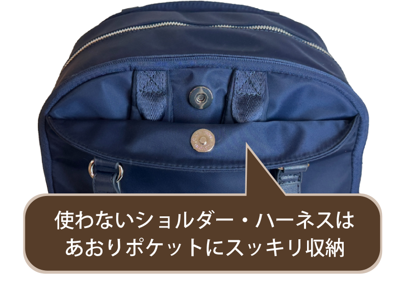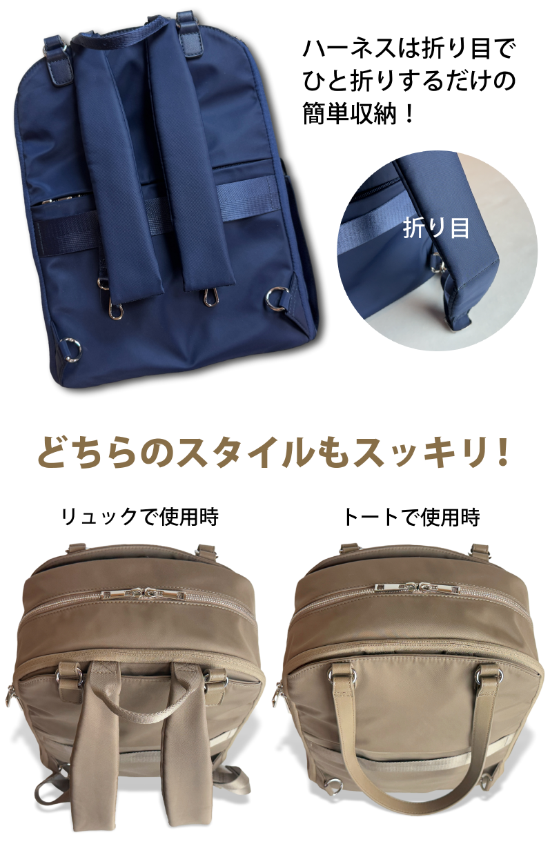 トートとリュックの2WAY構造は、バッグの前面背面に大きくとられたあおりポケットに使わないショルダー・ハーネスをスッキリ収納することで、スタイル変更が簡単にできます。