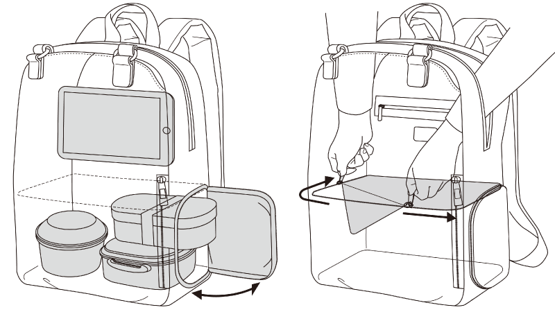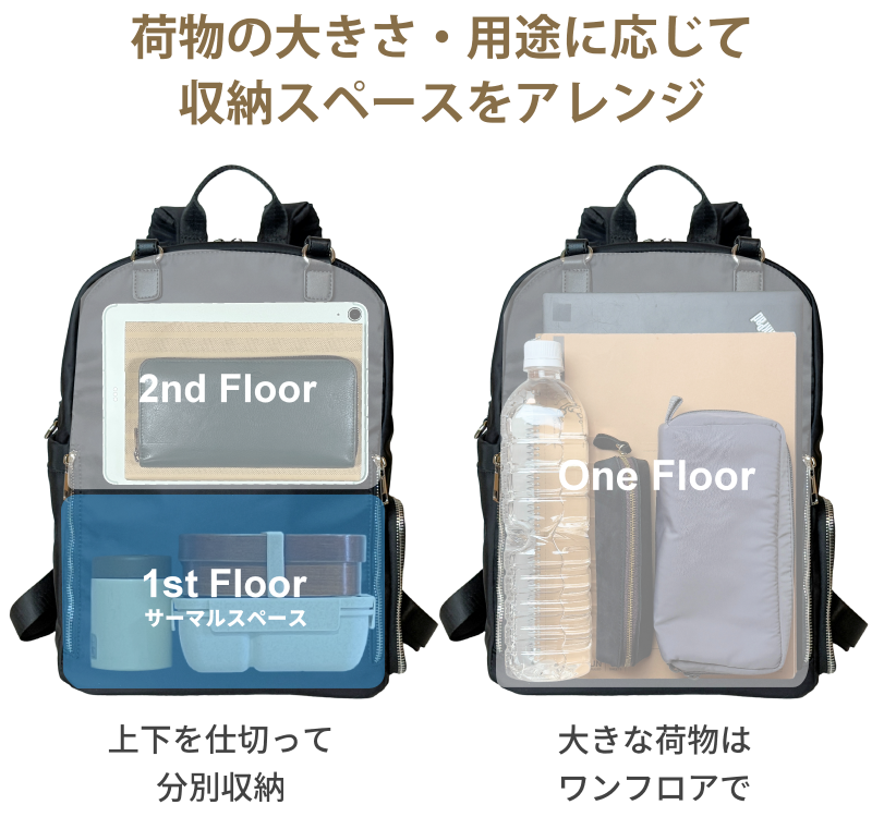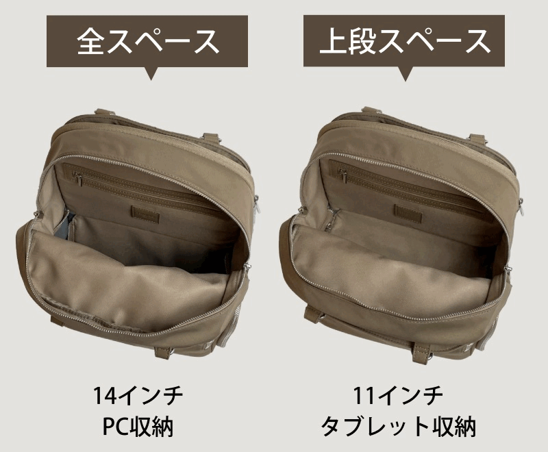 メイン収納スペースは、通常のバッグのようにバッグ全体を使用した大きなスペースと上下を仕切って2部屋にアレンジして分別することが出来ます。