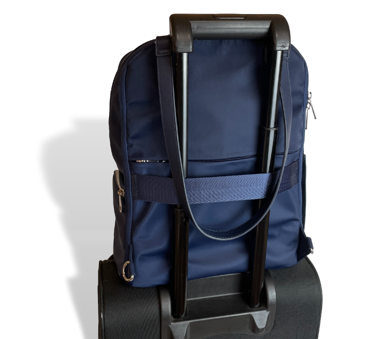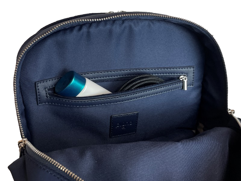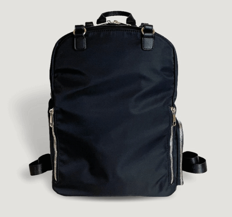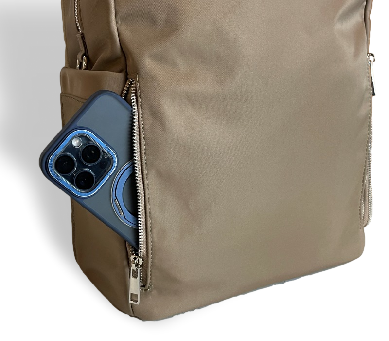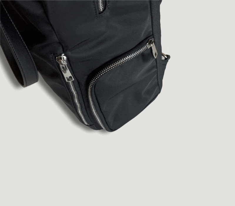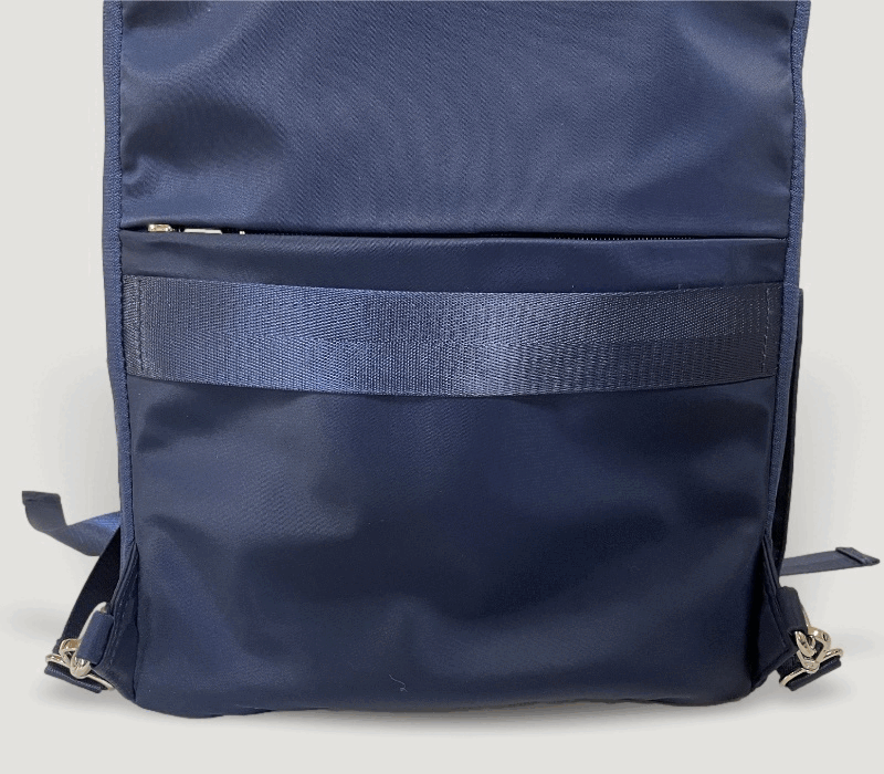バッグの後面にファスナーポケットを付けました。リュックを背負って移動時にパスポートや財布など貴重品を入れて盗難防止用として使用できます。