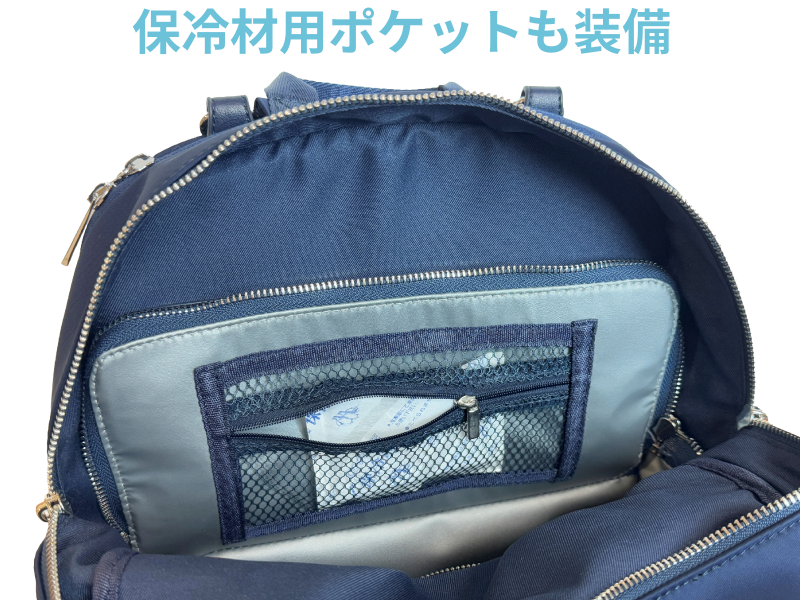 サーマルスペースは、ボトルコーヒーなどの900mlのペットボトルが入る奥行で、天井部分(仕切り裏側)には、保冷材などを入れることが出来るメッシュポケットが付いています。