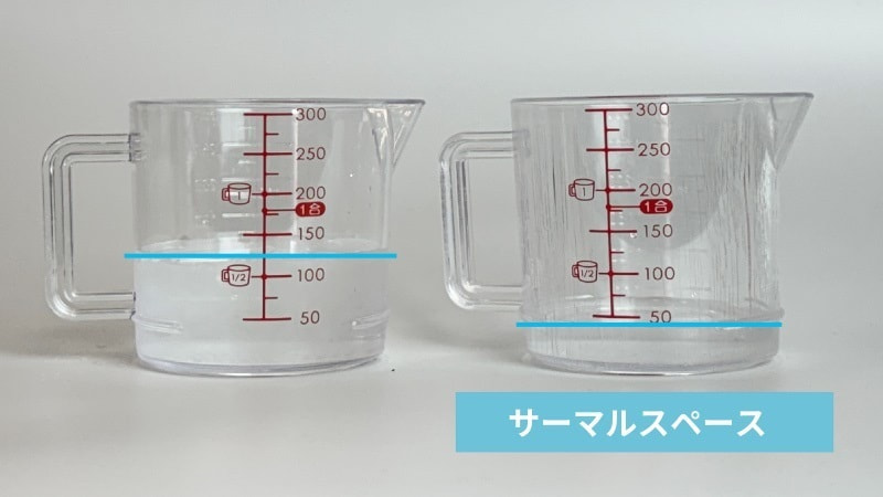 上の画像は、氷が溶けた水の分量を計量した結果です!サーマルスペースに入れた物と室内に放置した物では明らかに氷の溶けるスピードに差があることがわかります。この検証は、保冷剤は未使用で実施したので、保冷剤を使用した際は、より高い効果が期待できます。