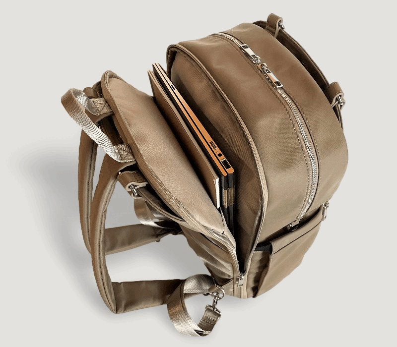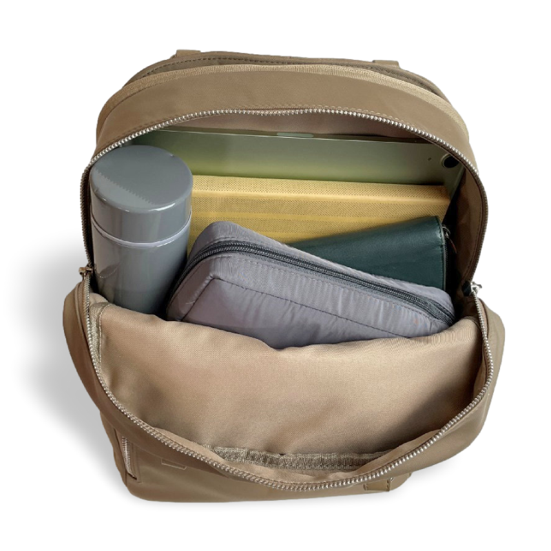 バッグ背面にクッションで補強された独立したファスナーでフルオープンするPCルームを搭載しました!リュック時、トート時に関わらずメイン収納を分別している際に安心して最大13インチのPCを持ち運べます。内側には、PCを固定する大きなポケットもあり、一緒にA4ファイルを入れることも可能です。
