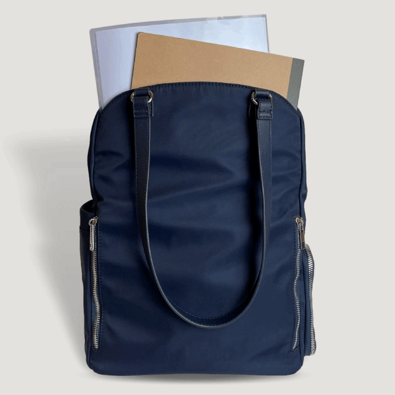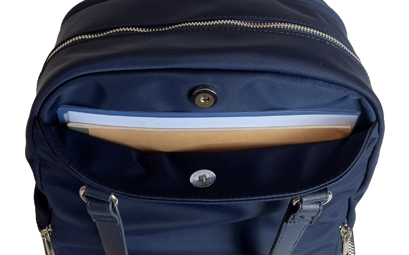 バッグの前面にあるマグネット開閉のあおりポケットは、リュックスタイル時にトートショルダーを収納する役割以外にも、A4サイズのファイルやノートを収納することが出来ます。