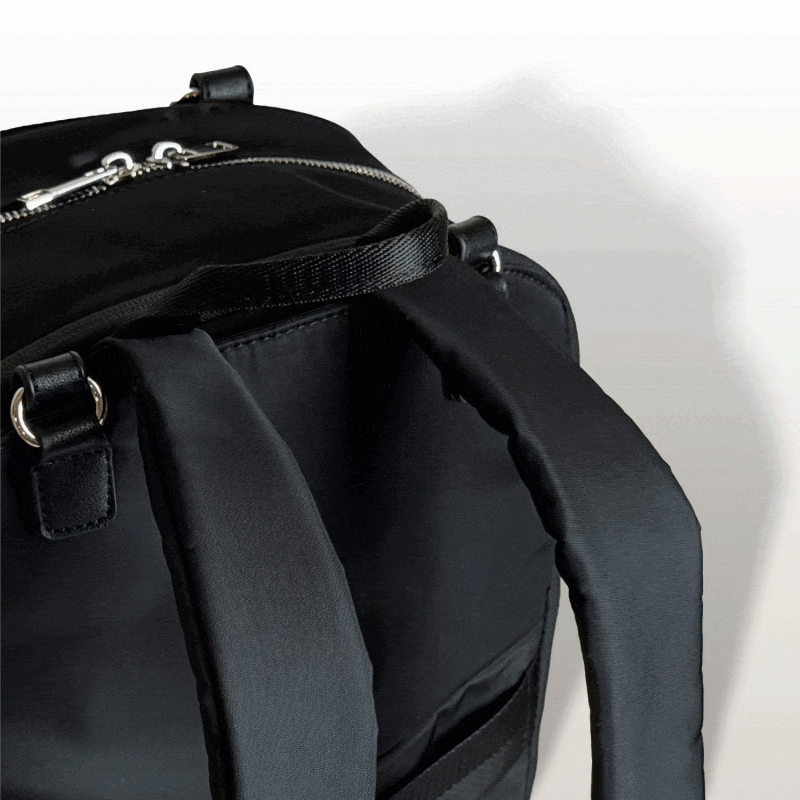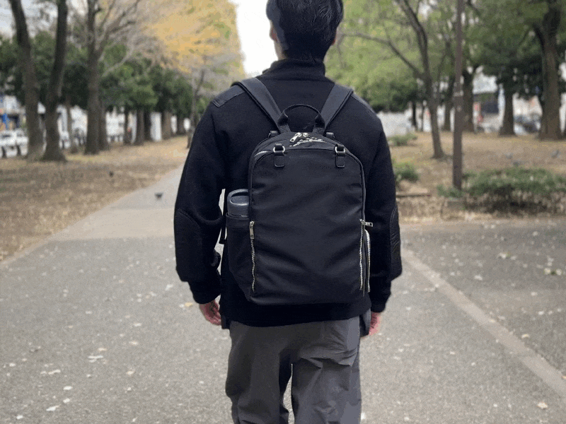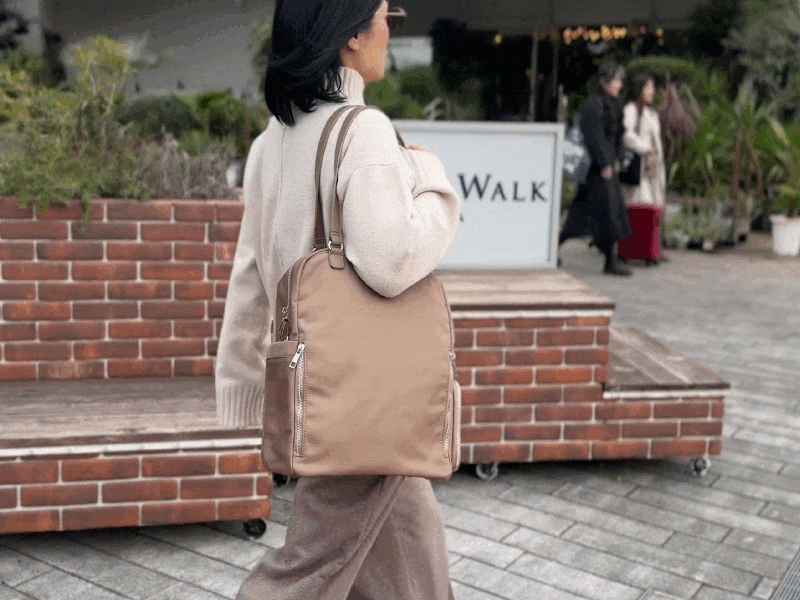 使わないショルダーやハーネスは、見た目では2WAYとわからないほどスッキリ収納でき、カジュアルになり過ぎず、スタイリングの邪魔もしないので、オンオフ幅広くご使用いただけます。