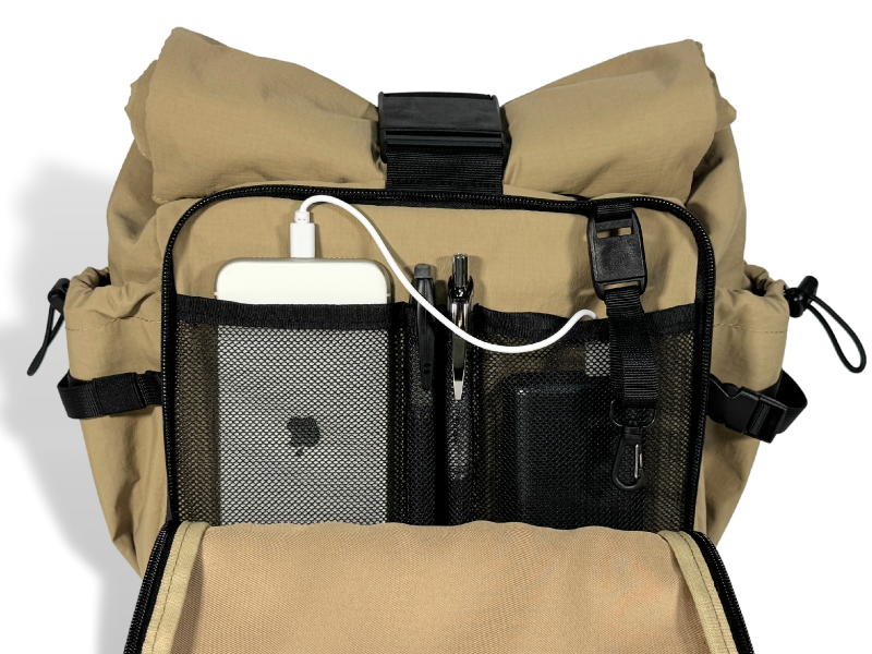 2つのメッシュポケットにバッテリーとスマートフォンを並べると充電しながらもスッキリ収納できたりもします。