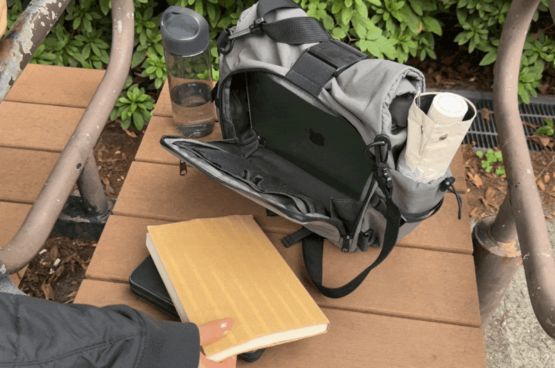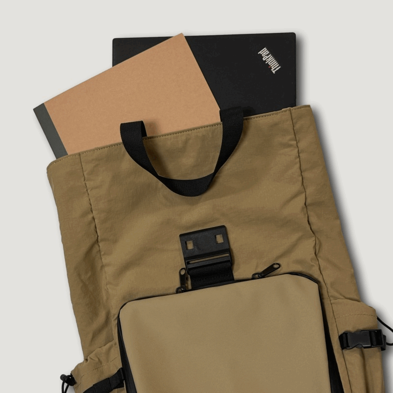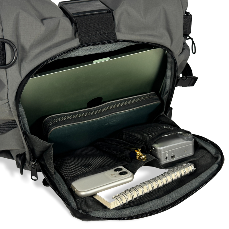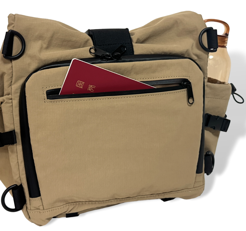 メイン収納にアクセスするためのバッグ背面に位置する開閉ポケットです。ロールトップを閉じている際に、タブレットや財布の出し入れも簡単です。