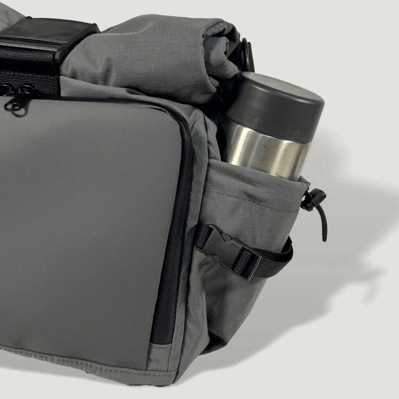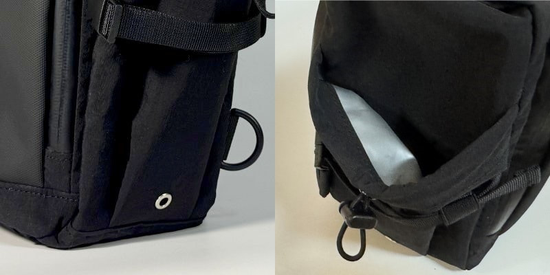 バック両サイドにあるポケットにはボトルやコンパクトな折りたたみ傘を入れることが出来ます。ポケットサイズは75mmΦまでのボトルを収納でき、細いボトルはポケット口を絞って固定することもできます。