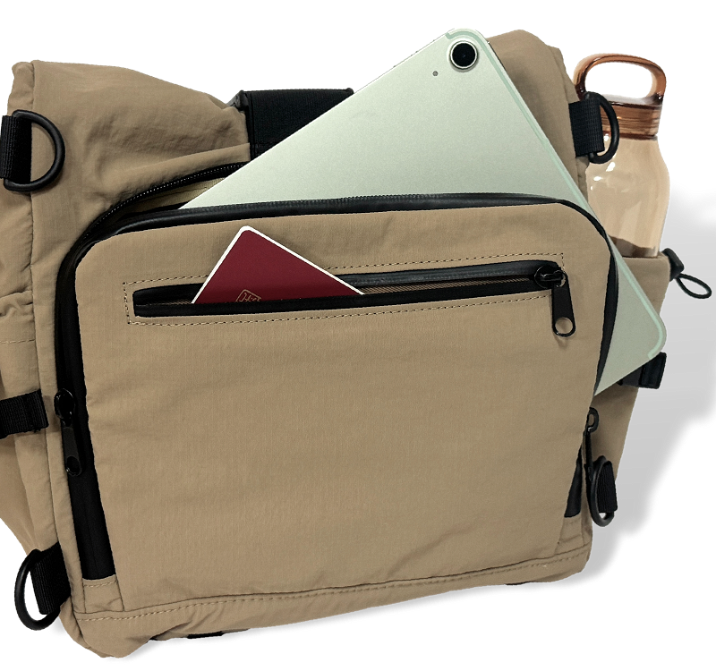 着用時に身体とバッグの間に位置するファスナーポケットは、旅先で持ち歩く大切なパスポートや鍵などを入れておける盗難の被害を防ぐセキュリティポケットです