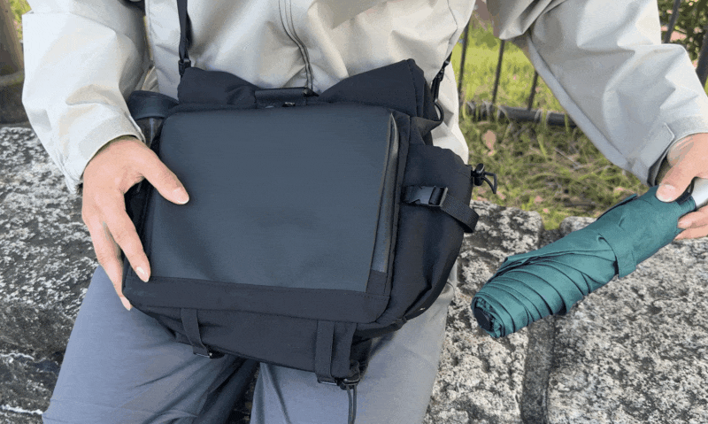 バッグ底部を活用したポケットは、折りたたみ傘の収納に便利です。ボトル収納ポケットと同様にポケット裏側には水を弾くPVC素材を採用しています。