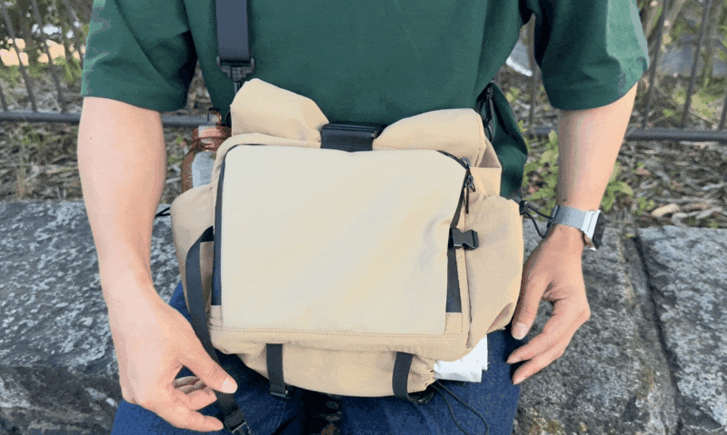 バッグ底部の長さ調節可能なストラップベルトを活用すると、三脚や衣類なども固定して持ち運ぶことが出来ます。