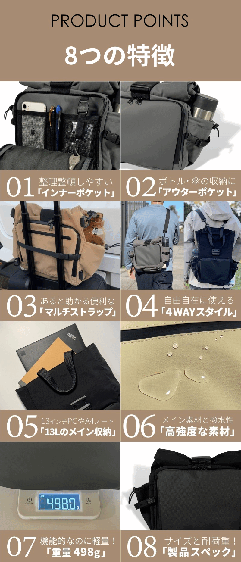 そんな時も、用途に合わせて自由に持てるスタイルフリーなバッグです。