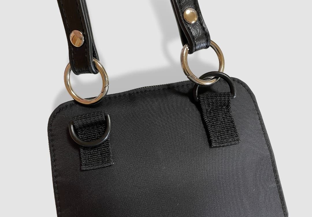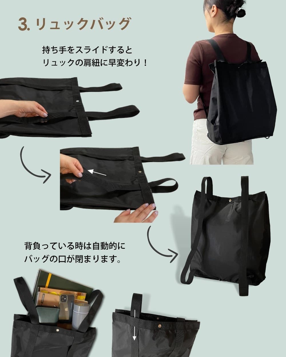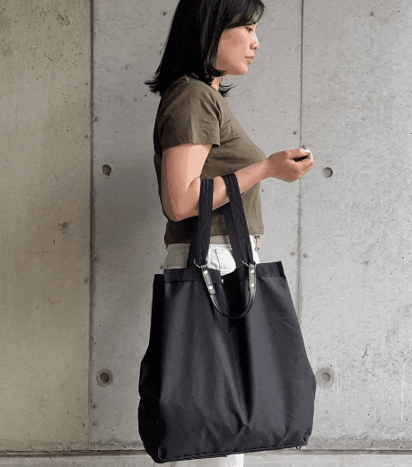 持ち手部分でもあるベルトをスライドさせるだけで、あっという間にリュックに早変わりします。両手を開けたい時や荷物が重たい時、そして自転車の移動時にとても便利です。肩紐をスライドすることで、背負っている時はバッグの口は自動的に閉まるので、物を落とす心配もありません。