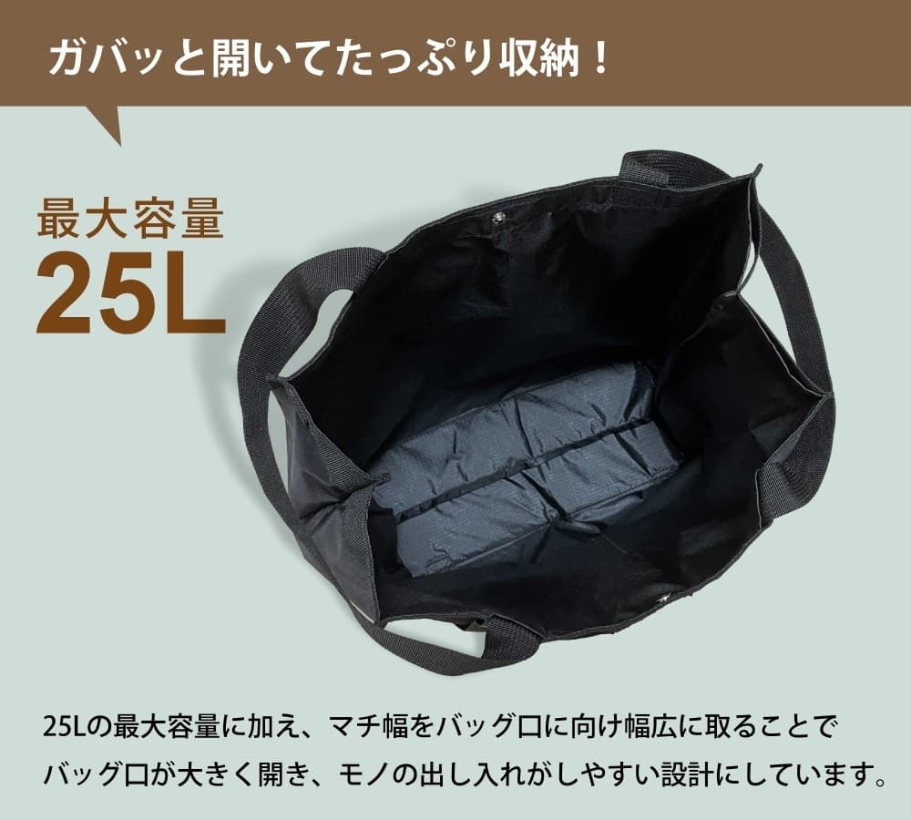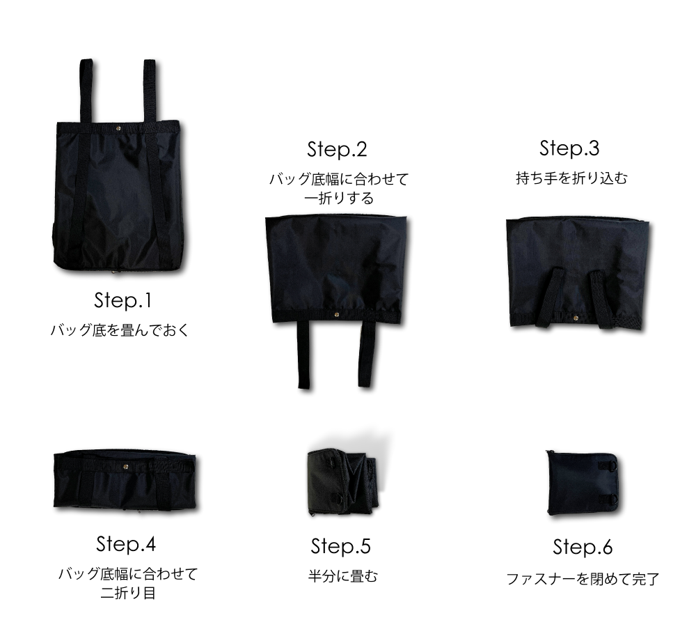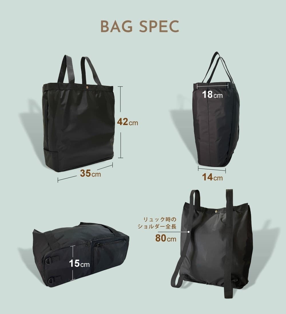 speseは、簡単にスッキリ収納できる持ち運びやすい折りたたみ式を採用しました。この設計は、折りたたみやすさはもちろん、バッグ底部分が収納袋の役割を果す一体型で、バッグ底部分の補強、そして安定した荷物の収納ができるように設計されています。