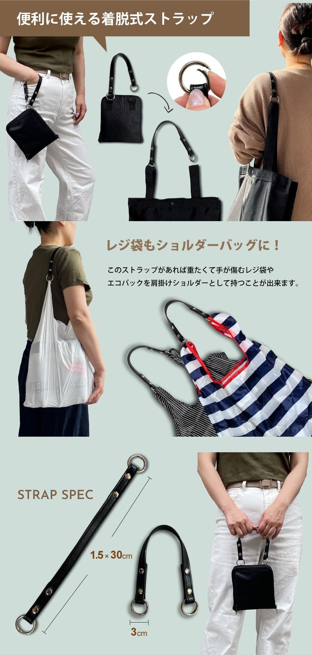またこのストラップは、単体でもレジ袋やエコバックに合わせてご利用いただけます。