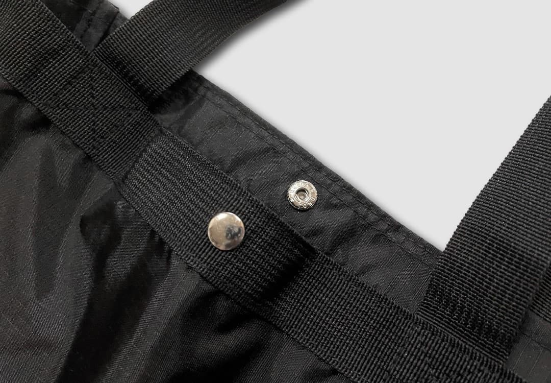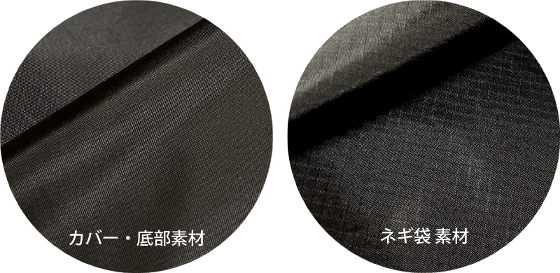 ネギ袋に使用したリップストップ素材は、メイン素材に比べ収納しやすい、一般的なエコバッグに使用される薄手の素材を採用しました。匂いが付着しやすいネギ袋は、しっかり水洗が可能です。