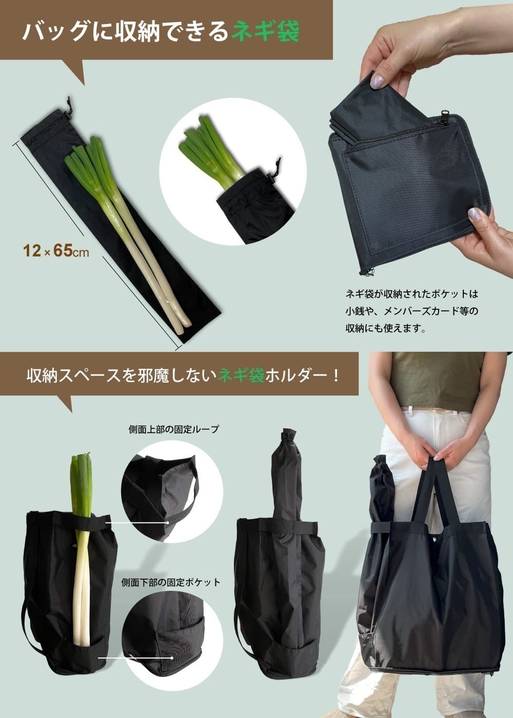 そんな悩みを解決するために、収納スペースを邪魔しないようネギ袋ホルダーをバッグ側面に付けました!